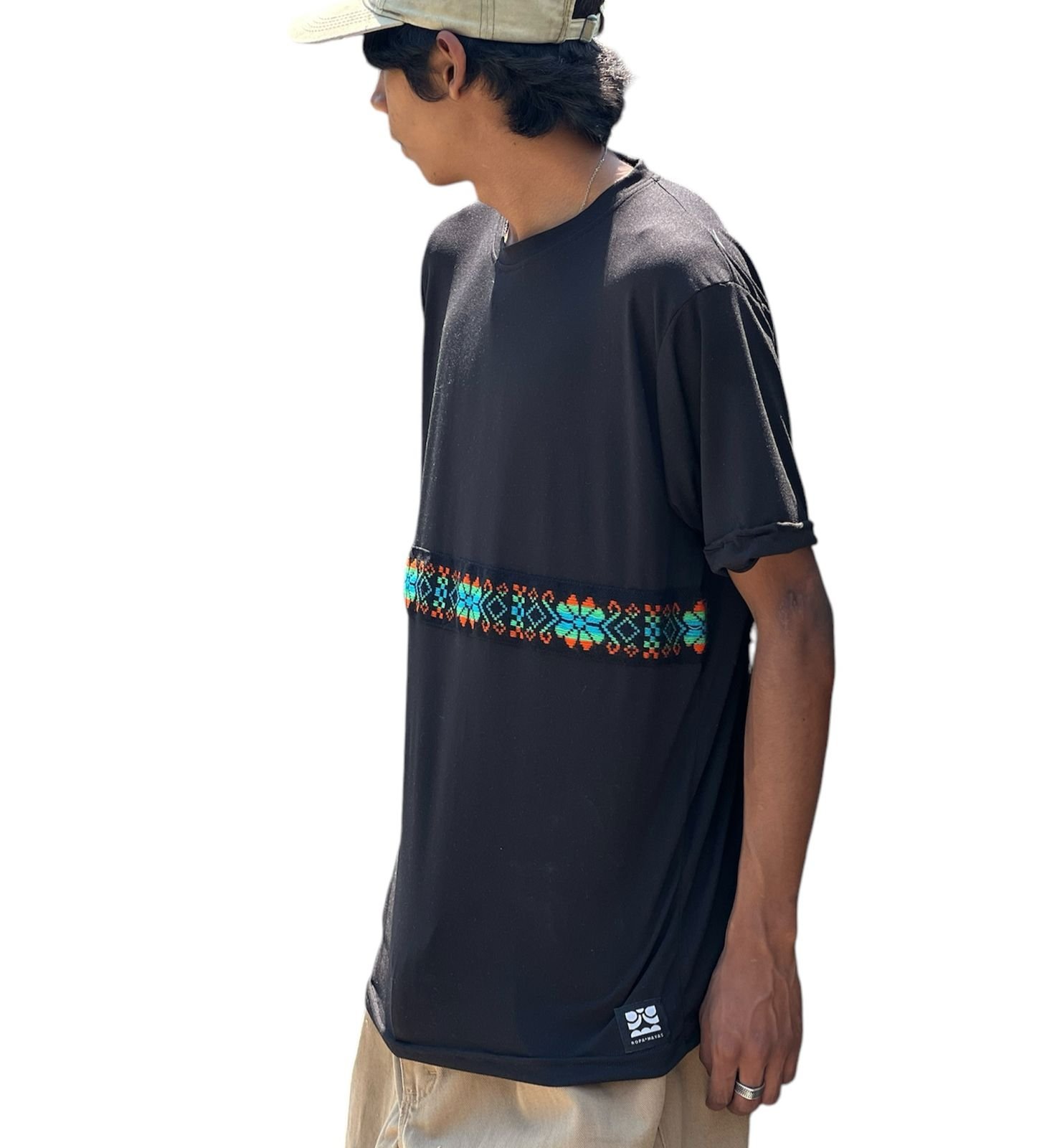 playera de algodon y licra, corte slim fit con intervencion de un bordado artesanal llamado cambaya.