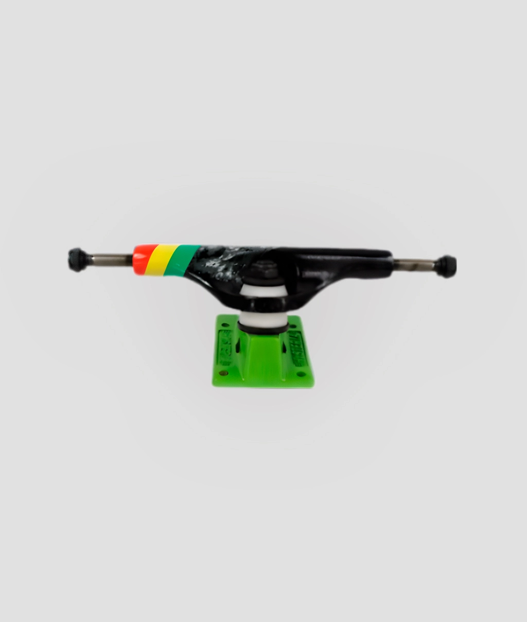 Fabricados con acero sólido, son resistentes y soportan el impacto y la abrasión, características esenciales para un rendimiento óptimo en el skateboarding. Con gomas de dureza media, para un buen equilibrio entre flexibilidad y estabilidad. La placa base está hecha de aluminio y el kingpin es de grado 8, lo que asegura una sólida construcción y confiabilidad en su uso.